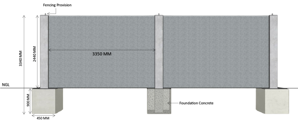 First foundation is created based on soil parameters; either a pile foundation or eccentric foundation is cast on site after which the compound columns are placed and wet joined into the foundation. In some cases the column wall can be directly driven into the soil without the need for a foundation. Based on the topography of the land we can manufacture columns of varying height to help maintain the top level of the compound wall. Or add backfill to increase the ground level. Lastly the compound slabs are slid into place between the columns.