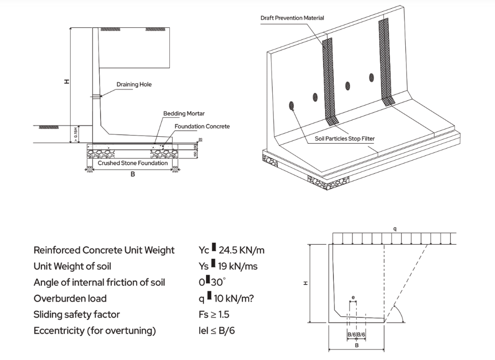 Designs are dependent on project specifications and applications. Soil type and soil retaining levels. Lateral earth loads from soil and hydrostatic loads from ground water. Surcharge loads from nearby impact loads. Seismic loads where applicable. After determining the size and design parameters required the appropriate ISO standards are used to provide the most economical design.