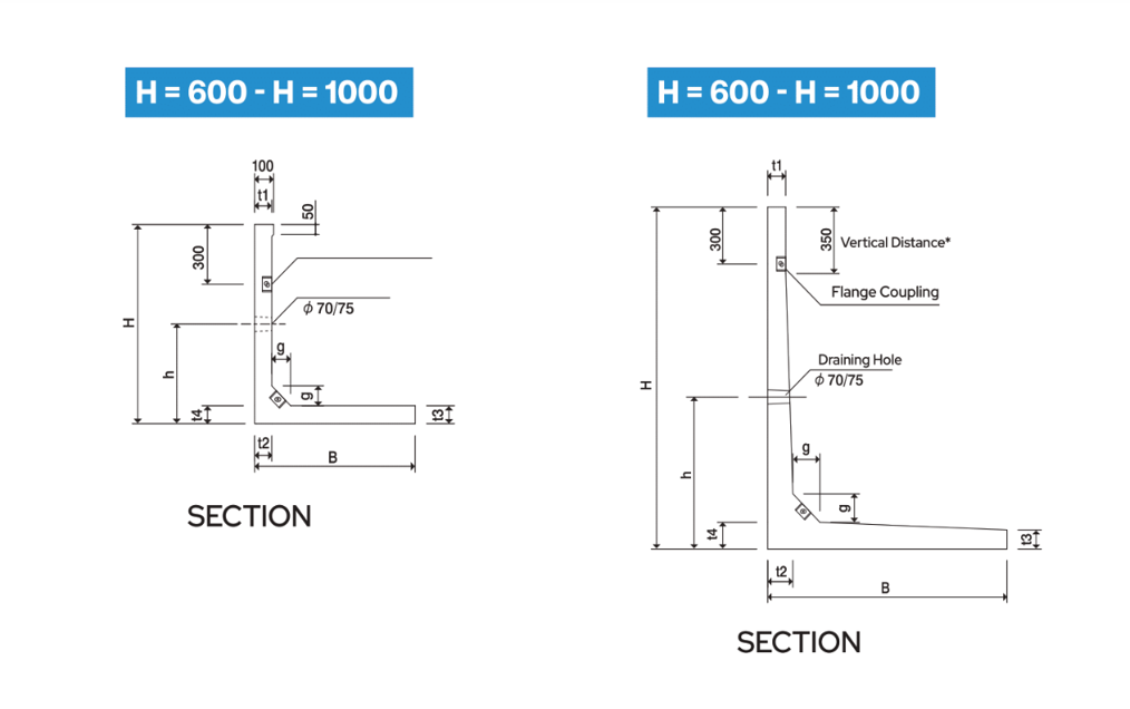| Size (mm) | Dimensions of Retained Wall (mm) | ||||||||